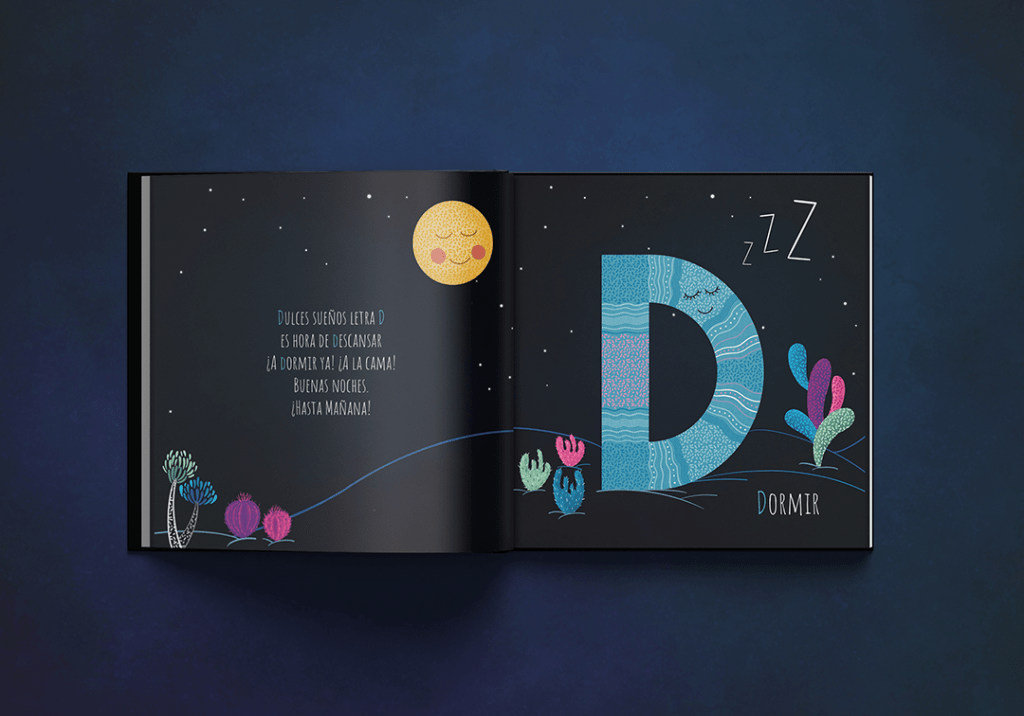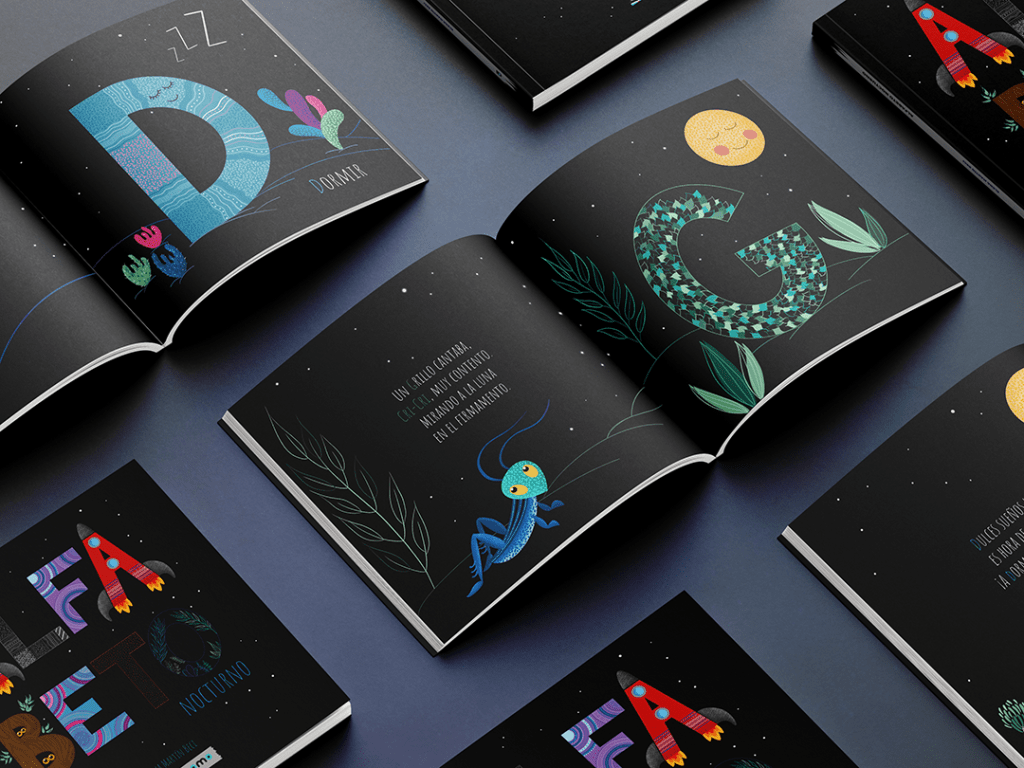 Para darle vida, seleccioné conceptos que evocan la calma y la magia de la noche. Diseñé cada personaje y escena cuidando que las letras formaran parte esencial de la composición, logrando un conjunto cohesionado y evocador. También asumí con entusiasmo el diseño de la portada y la maquetación de cada página.